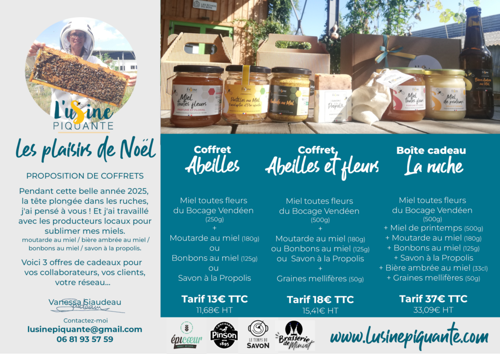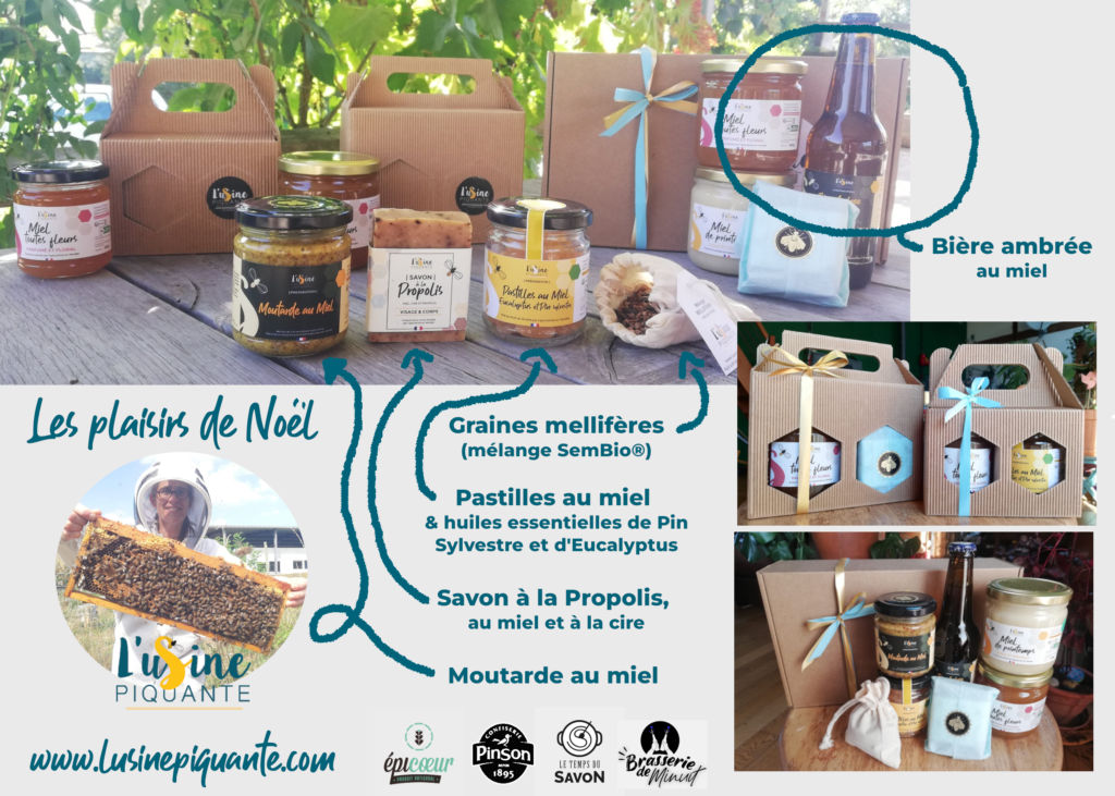 Pendant cette belle année 2025, la tête plongée dans les ruches, j’ai pensé à vous ! Et j’ai travaillé avec les producteurs locaux pour sublimer mes miels. Moutarde au miel / bière ambrée au miel / bonbons au miel / savon à la propolis.